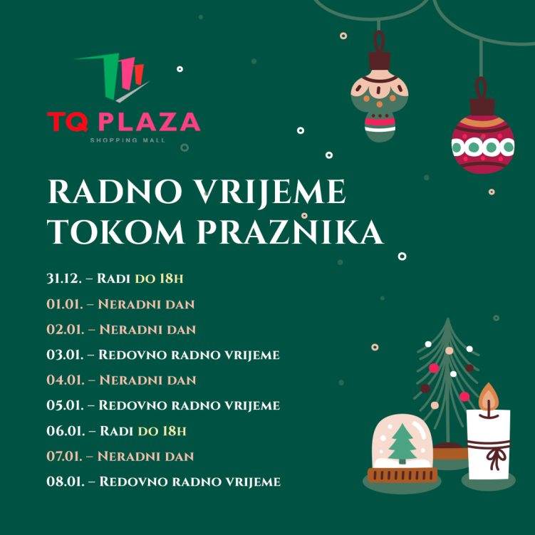 Radno vrijeme tokom predstojećih praznikaRadno vreme za praznike Published by tqadmin on December 29, 2025 Categories News and Events Vijesti i dogadjaji Tags 🎄🎁Vidimo se kod centralne jelke!📅 30.12.2025. | ⏰ 16–18hDeda Mraz dolazi i dijeli paketiće — družimo se! ✨ Share0 Related postsDecember 29, 2025Radno vreme za praznikeRead moreApril 15, 2025Radno vrijeme tokom predstojećih praznikaRead moreJuly 11, 2024Radno vrijeme tokom predstojećih praznikaRead more Leave a Reply Cancel replyYour email address will not be published. Required fields are marked *Comment * Name * Email * Website Save my name, email, and website in this browser for the next time I comment.